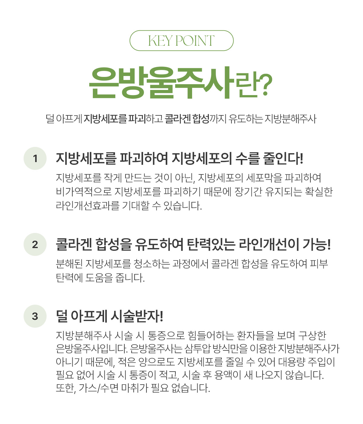 블루밍의원의 은방울주사는 대표원장의 노하우를 통해 제조한 약물로 적은 통증으로 뛰어난 지방분해효과를 보여줍니다.